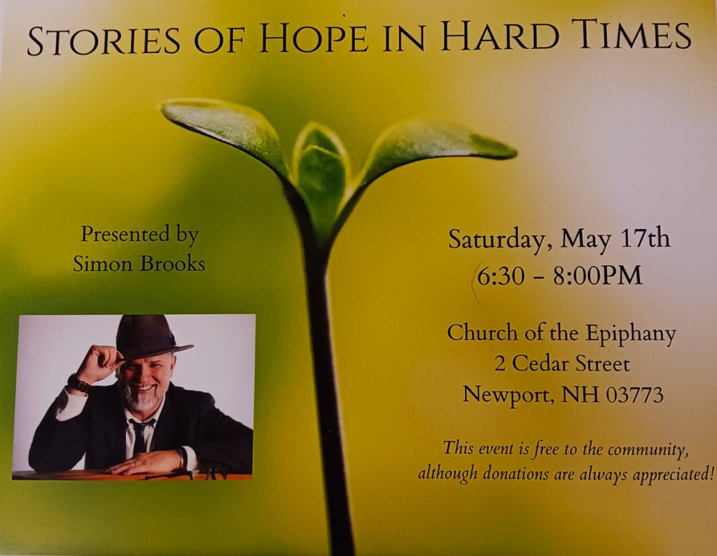 Is this a Hard Time? Yes! Our Hope is in the Lord. Our Hope is in the Resurrection. Hope is kindled and encouraged by all the stories we share that remind us of Grace and Courage and Resilience. We share our sacred stories week by week AND we share a heritage of folk tales filled with humor and grace. Simon Brooks presents hope-filled stories from many lands that will fill us with joy. This Festival of Hope on Saturday May 17 beginning at 6:30 pm is suitable for all ages. There is no charge for this delightful evening. Donations are appreciated.